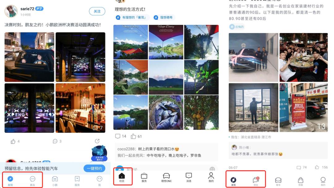 不过比起线下,线上渠道现在变得越发重要,各家厂商也化身成社交软件公司,开启打造自己的“朋友圈”。比如小鹏、理想、蔚来等厂商推出的手机APP,都在首页的底部导航栏加入了社交入口,点进去就能看到瀑布流的各种动态,加上许多车友自发组织的社群club,比如摄影节、剧本杀活动、歌唱比赛、自驾游分享等。汽车成为了一张社群的入场门票,提供超越了代步的服务,帮助用户连接更多人。