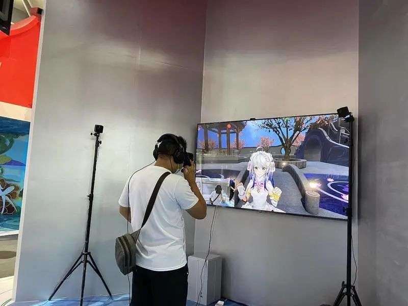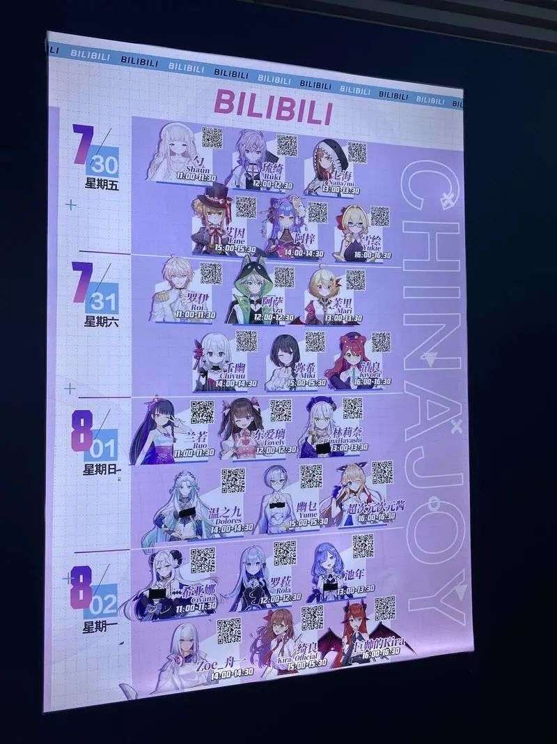 过去一年共有3万多名虚拟主播开播的B站展台也有类似的互动环节,那是一个更加密封的小房间,每次允许一位玩家进入,设备没有快手展台这么复杂。相比主打VR体验的快手,B站的优势在于多样的虚拟主播,每日上午11时到下午16时30分,展台都会提供六位虚拟主播与玩家互动。但在8月2日上午,也许是防疫措施的升级,以上两项活动均处于暂停状态。