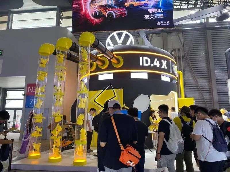 来到ChinaJoy的传统车企都瞧上了“年轻人的第一辆车”这个空位。上汽大众将展台设立在快手对面,旗下新能源车型ID.4X与皮卡丘达成联名,他们还设计了一个装置,将几十只皮卡丘玩偶塞入透明管道中“为车发电”。