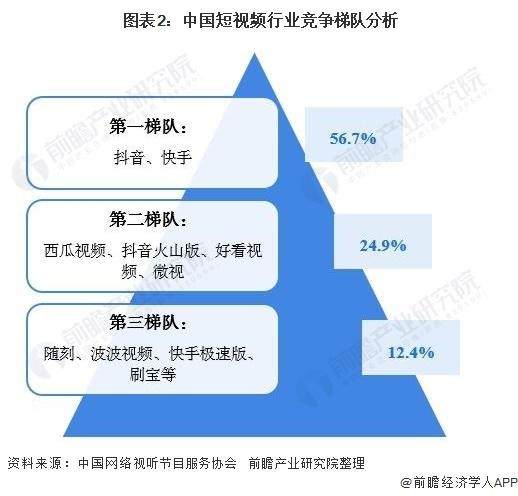 根据前瞻研究院发布的数据显示,抖音短视频主APP和快手主APP位居中国短视频领域第一梯队,两者活跃用户规模约占整体的56.7%,字节旗下的西瓜视频、抖音火山版,与百度的好看视频,腾讯的微视共处第二梯队,活跃用户规模占24.9%;抖音极速版则处第三梯队,共分12.4%的市场份额。