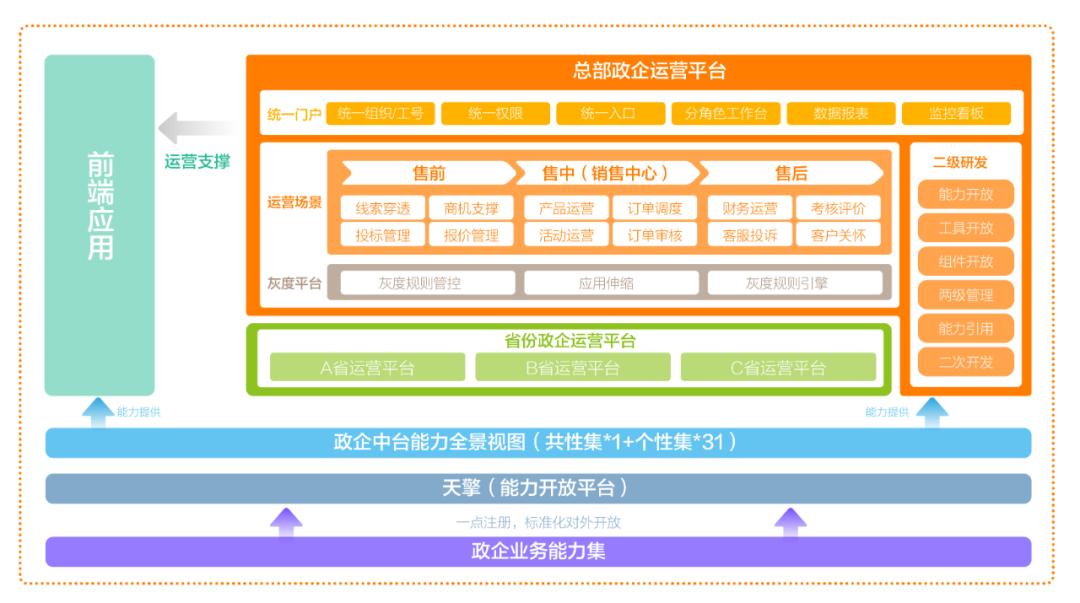 2021年中国联通总部遵循集团总体战略要求,推进全面数字化转型,加快中国联通政企中台战略的实施,配合政企领域业务特点,推进政企运营平台的建设和运营体系的搭建。政企运营平台将聚焦政企侧客户需求,构建高效扁平、纵向穿透、横向协同、集约一体的政企运营体系。