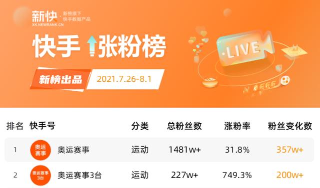 据新快数据,最近一周的快手涨粉榜前两名都是快手体育官方账号。