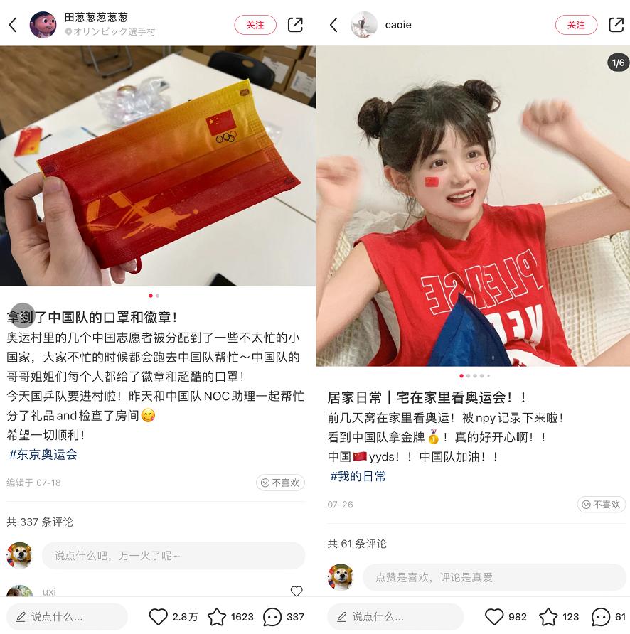 不仅关注奥运赛场上的激烈竞争,小红书博主同样乐于分享赛场的周边。博主“田葱葱葱葱葱”作为志愿者,分享了中国队的口罩和徽章,截至目前已获得2.8万点赞。博主“caoie”晒出自己在家看奥运会的照片,评论区不乏用户夸赞造型可爱,以及询问衣服链接。