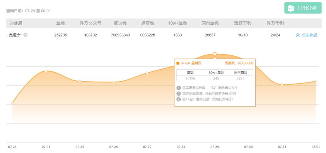 据新榜日常监测的近百万微信公众号样本数据显示,自7月23日至8月1日,以"奥运会”为关键词进行搜索,至少有1869篇阅读量10万+推文。其中“环球时报”、“环球网”、“人民日报”、“央视新闻”等官媒单日内连续发文,实时公布奥运会奖牌情况。