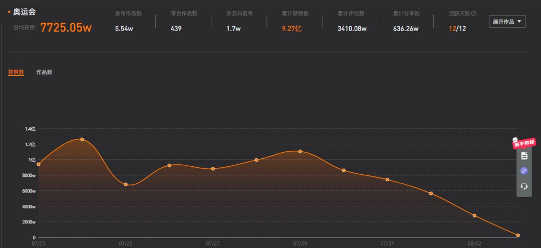 据新抖数据显示,自7月23日至今,“奥运会”相关话题累计获赞达到9.27亿,日均获赞达到7725.05万。