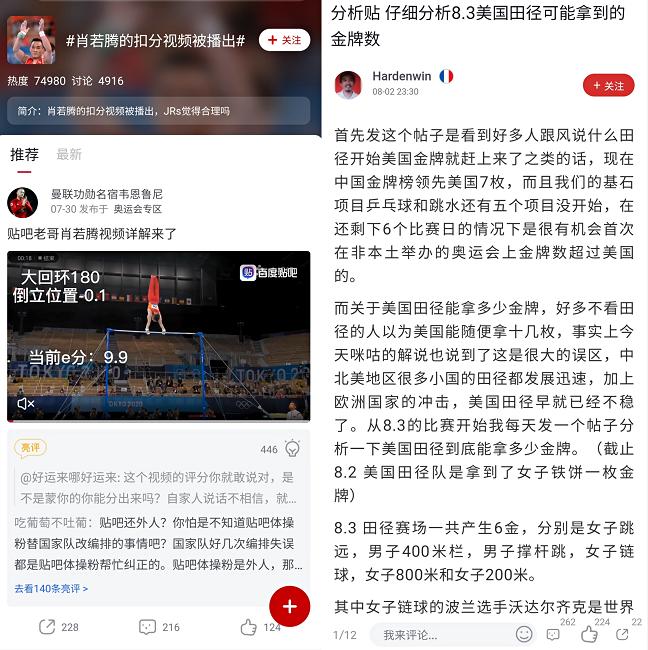 相比而言,男性占比较高的虎扑大多从技术流出发,讨论奥运比赛中出现的争议点,比如体操比赛中肖若腾被扣分,或者分析今年美国田径可能获得的金牌数等等,内容偏硬核。