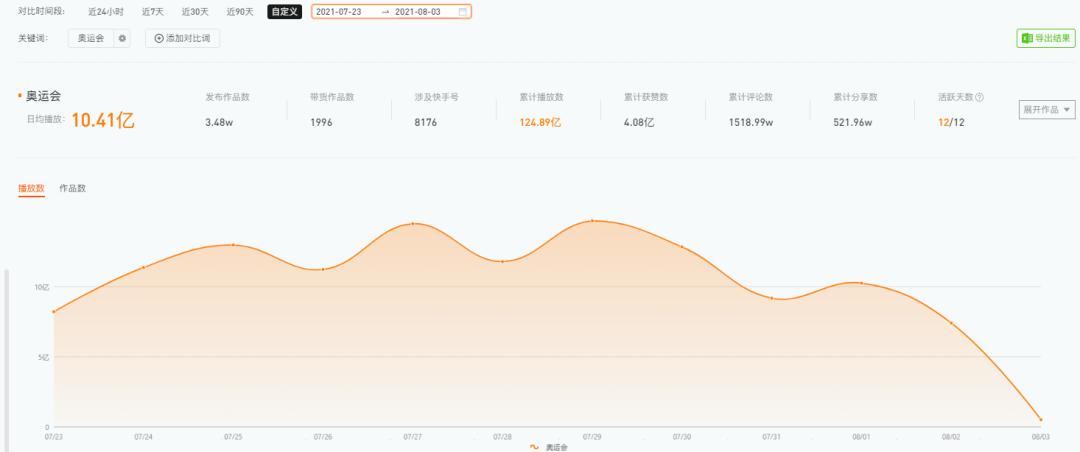 据新快声量查询功能,从7月23日至今,“奥运会”相关内容在快手上的日均播放量超10.4亿,至少有8176个快手账号发布相关作品,累计播放量124.89亿。
