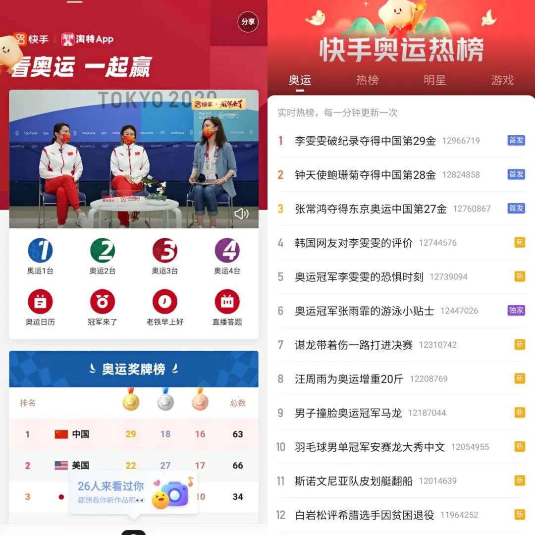 作为全球首家参与奥运转播的短视频平台,快手直接单独设立了奥运版块和快手奥运热榜。
