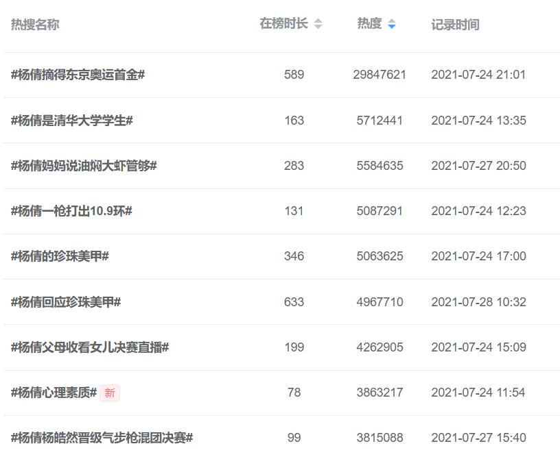 #杨倩摘得东京奥运首金#作为首个摘金话题,截至发稿前,该话题阅读量已经达到24.3亿。相关衍生话题也先后登上热搜。