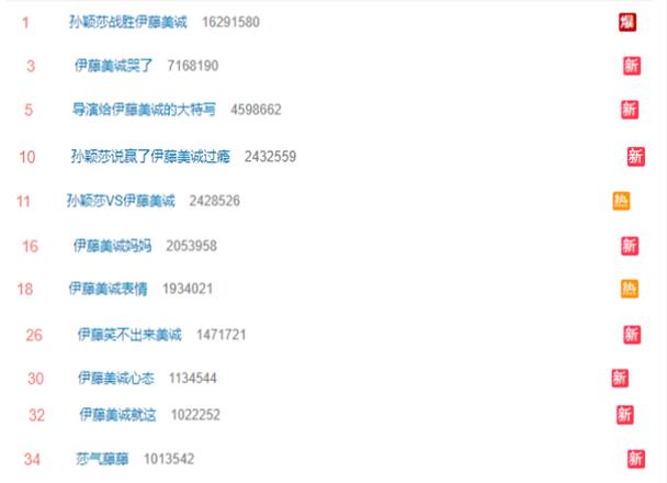 当孙颖莎以4-0横扫对方后,微博热搜几近被“伊藤美诚”引爆。据新榜观察,7月29日13时左右,与伊藤美诚相关热搜数量达到11个。