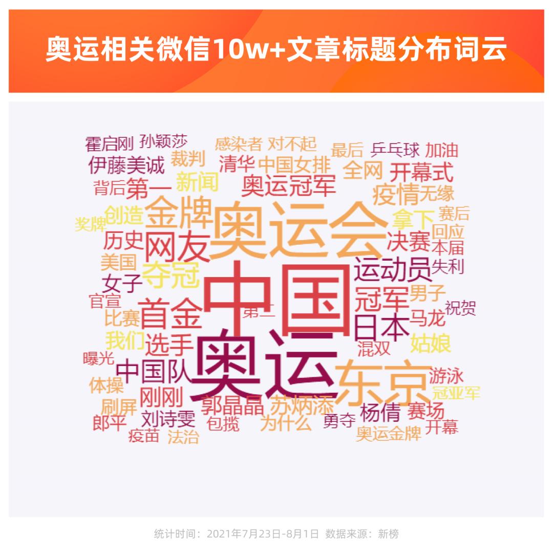 在这1869篇微信10万+中的标题中,“奥运会”“中国”“东京”“夺冠”等词被高频提及。
