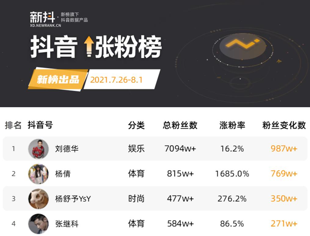 值得一提的是,在上周抖音涨粉榜中,杨倩、杨舒予、张继科分别位列第2-4名,涨粉量均在200万以上。