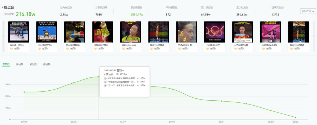 播放量峰值出现在了7月29日,达到14.69亿。当日排名前三的奥运视频分别是张雨霏夺女子200米蝶泳冠军、中国队女子4×200米自由泳接力夺金打破了世界纪录、乒乓球女子单打决赛陈梦获金牌。
