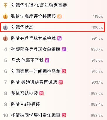 7月29日,刘德华在抖音的出道40周年直播累计超1亿人次观看,仍难挡奥运热度。据当晚抖音热搜榜显示,“刘德华”状态热搜最高位于第二,剩余热搜前十中奥运相关话题占八席。