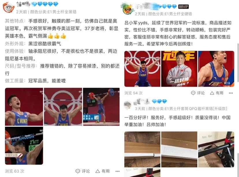 其中销量最好的是运动护腕带、护掌带和训练杠铃杆。正值奥运会,有不少网友是看了吕小军夺冠之后的出色表现下单购买的,在商品评价里已有很多“打call”评论:“祝贺军神勇夺奥运冠军”“吕小军yyds”“一百分好评,中国举重加油!”