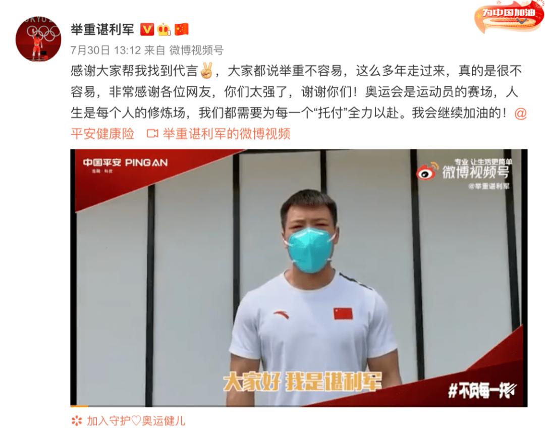 谌利军夺冠后,网友们在社交媒体上呼吁商家选择其作为代言人。7月30日,平安健康险正式宣布邀请谌利军担任健康大使。