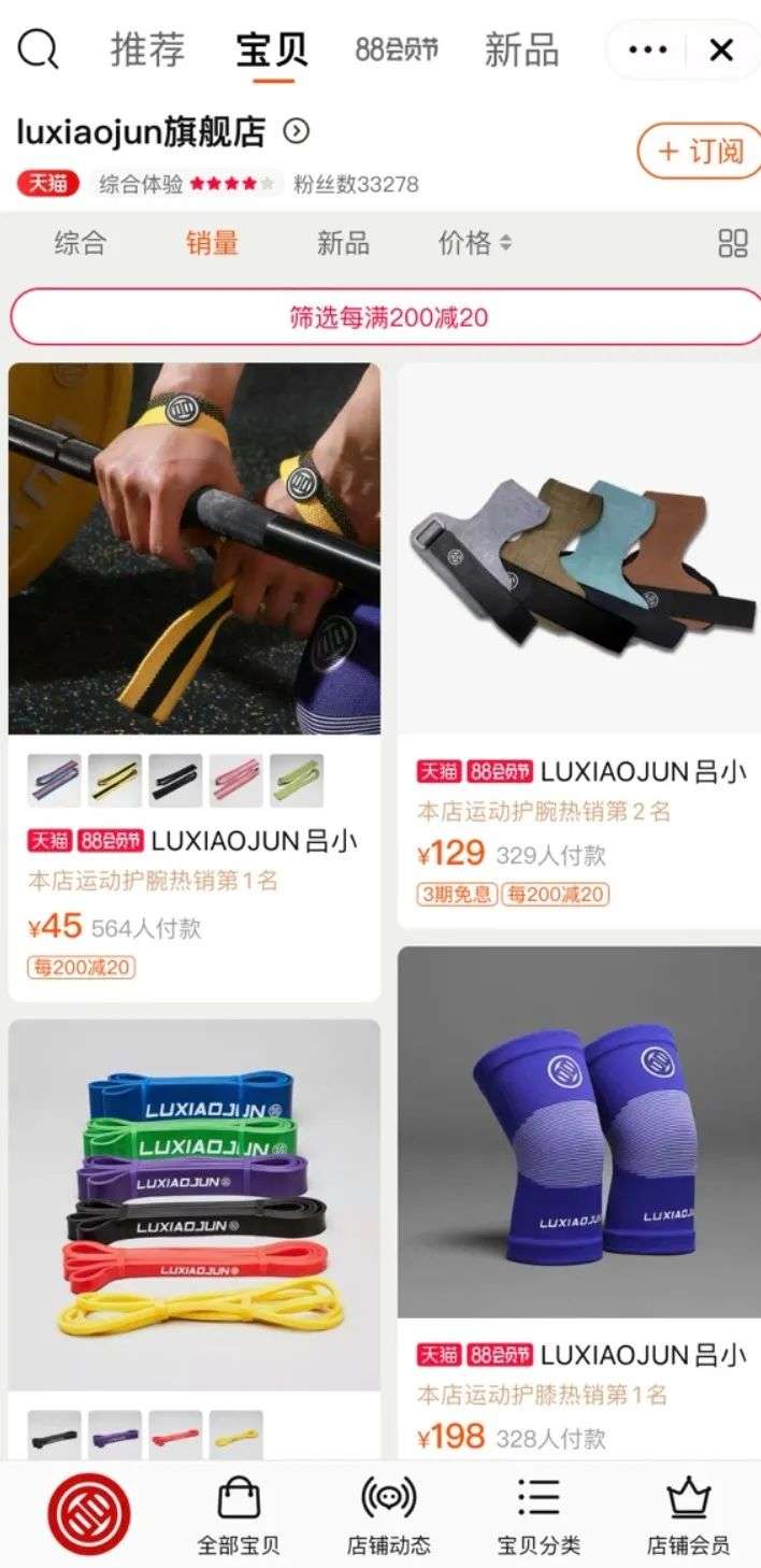 2017年,吕小军开始授权运营方在线上开店。一开始是一家名为“吕小军举重”的淘宝店,第二年又有了一家名为LUXIAOJUN的天猫旗舰店,将竞技训练与日渐流行的健身日常对接。现在,淘宝店粉丝过万,天猫店粉丝数超过3万。