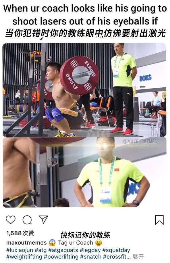 在Instagram和YouTube上,吕小军也被外国网友玩出许多梗:比如背部可夹硬币、夹A4纸这样高难度动作是小菜一碟;脚上的冠军“黄金战靴”仿佛游戏装备,像是有力量+99的神力;吕小军的身后,于教练如激光般犀利的眼神里容不下任何一个不规范动作……