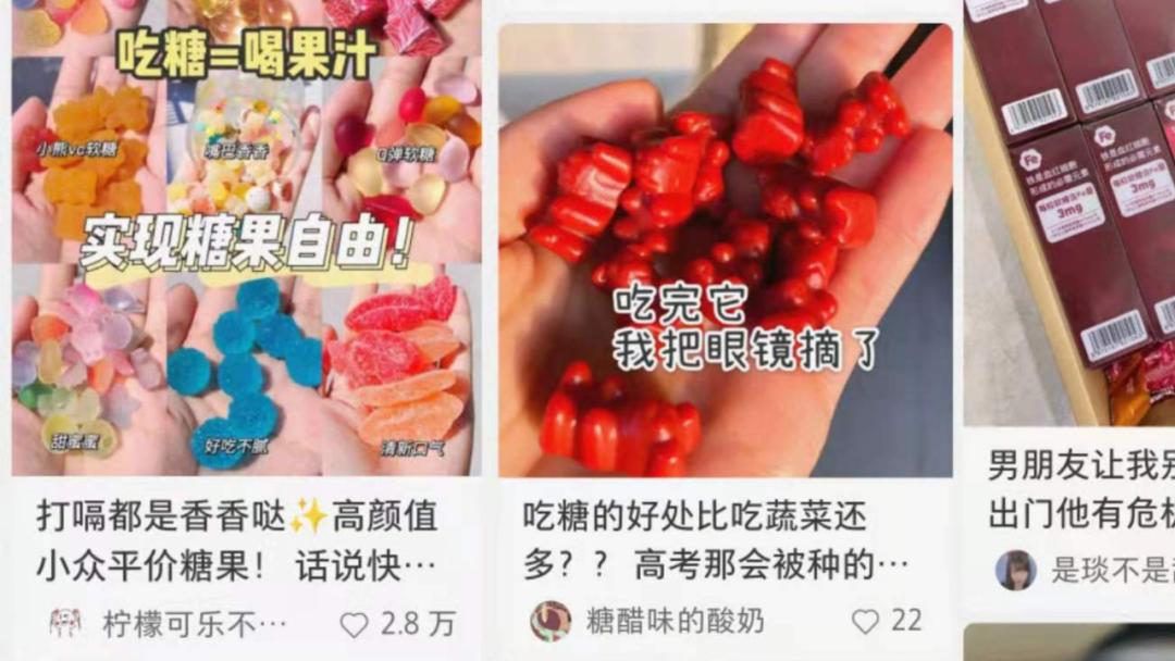 例如在小红书上“软糖”的相关笔记超过31万篇,在搜索结果详情页还会出现“保健品”、“补铁”、“维生素”、“助眠”、“褪黑素”等多个功能性分类。惊蛰研究所单独搜索“维生素软糖”发现有超过2万篇笔记,大部分文案也是在强调补充维生素等功能型诉求,以及好吃等产品特点。不少笔记文案中还用到了“吃糖=喝果汁”“吃完它我把眼镜摘了”等描述产品功能的夸张话术,吸引了不少年轻人在评论区询问具体的产品体验。
