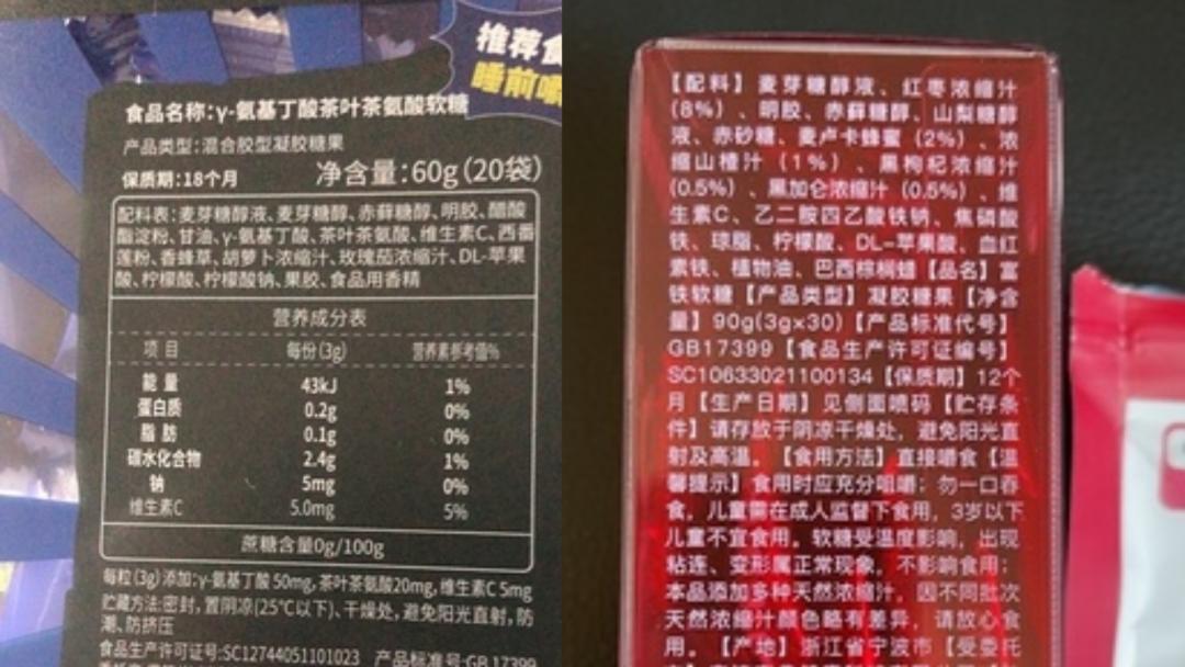 因此,对比《预包装食品标签通则》可以发现,上述两款软糖产品中的主要成分为甜味剂和明胶等食品添加剂,而在宣传中为产品提供功能作用的添加物——氨基丁酸、维生素C以及焦磷酸铁等均排在配料表中靠后的位置。
