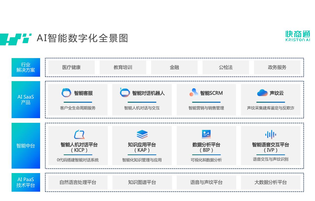 以AI能力为支撑,快商通提出以中台赋能产品,以产品赋能产业营销智能数字化的战略。基于智能人机对话平台KICP、知识应用平台KAP、数据分析平台BIP、智能语音交互平台IVP四大中台,辐射到企业用户客服云、销售云、营销云。通过智能客服、智能对话机器人、智能SCRM等AI SaaS产品,帮助中国中小企业完成供给侧升级,实现产业营销智能数字化;通过包含声纹采集、建库、分析、研判、反欺诈的声纹云,赋能公安、金融、社保等多个领域,为其提供语音智能化解决方案,实现数字化智能治理。