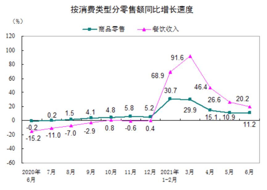 按消费类型分,6月份商品零售33663亿元,同比增长11.2%,两年平均增长5.4%