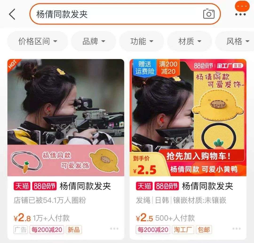 7月24日,00后女子气枪选手杨倩夺得本届东京奥运会首金后,以一人之力带火了三件商品:头上的小黄鸭发夹、胡萝卜发绳和珍珠美甲。杨倩同款饰品始终稳居淘宝奥运热搜榜单第一位。