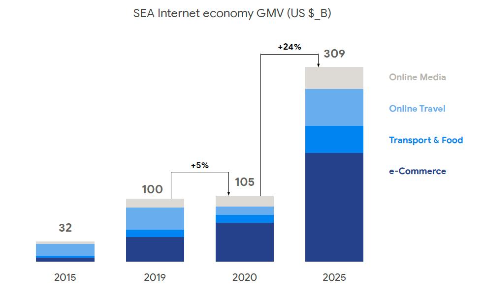 “据Google、Temasek以及咨询公司Bain&Co共同发布的《2020年东南亚电子商务报告》(以下简称《报告》)显示,2020年东南亚的互联网经济达1050亿美元,且在2025年有望达到3090亿美元。”