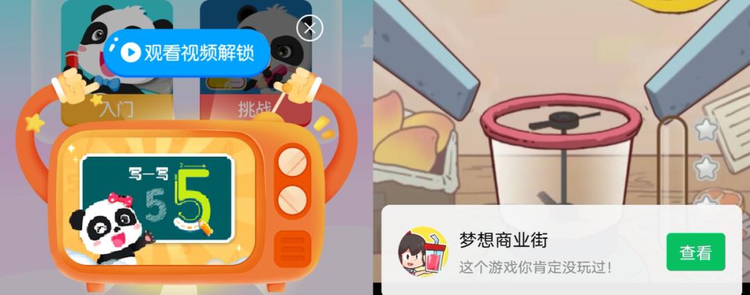 再比如由宝宝巴士(福建)网络科技有限公司开发的小程序“奇妙数学王国”,学写数字下方,就是醒目的游戏推广。此外,用户还可以通过观看视频解锁关卡,内容则是“梦想商业街”的游戏试玩视频。