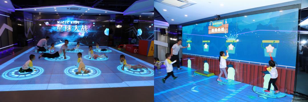 MAGIC KID以沉浸式全息大屏为主要载体,利用多种IoT设备、传感器、AI技术手段等,实现全场景的智慧互动教学,大大提升了儿童体适能的趣味性和体验感。