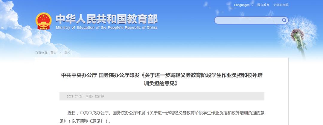 7月24日,中共中央办公厅、国务院办公厅印发《关于进一步减轻义务教育阶段学生作业负担和校外培训负担的意见》(以下简称“意见”)。