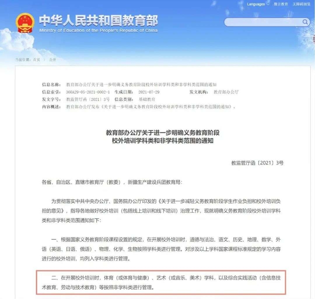 7月28日,教育部办公厅发布《关于进一步明确义务教育阶段校外培训学科类和非学科类范围的通知》。其中,明确指出:在开展校外培训时,体育(或体育与健康)、艺术(或音乐、美术)学科,以及综合实践活动(含信息技术教育、劳动与技术教育)等按照非学科类进行管理。