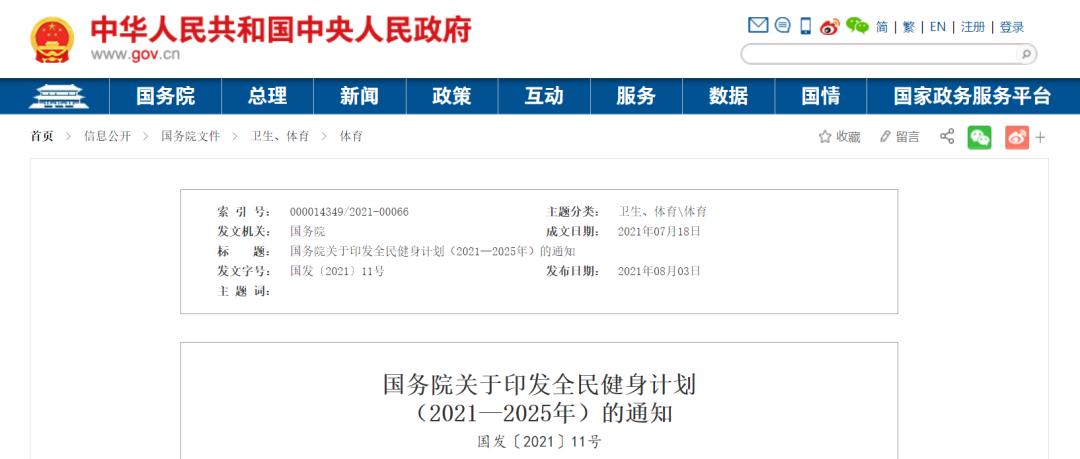 8月3日,国务院印发《全民健身计划(2021—2025年)》(以下简称“计划”),《计划》明确到2025年,经常参加体育锻炼人数比例达到38.5%,县(市、区)、乡镇(街道)、行政村(社区)三级公共健身设施和社区15分钟健身圈实现全覆盖,每千人拥有社会体育指导员2.16名,带动全国体育产业总规模达到5万亿元。