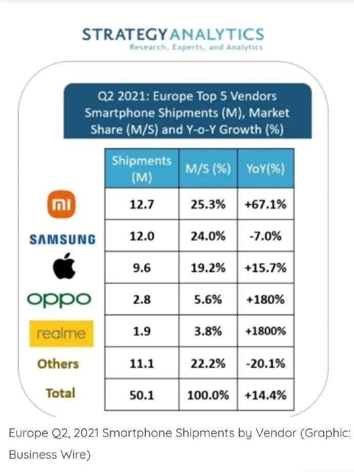 2021年Q2欧洲市场小米也混得风生水起,手机销量超越三星,首次成为欧洲第一。