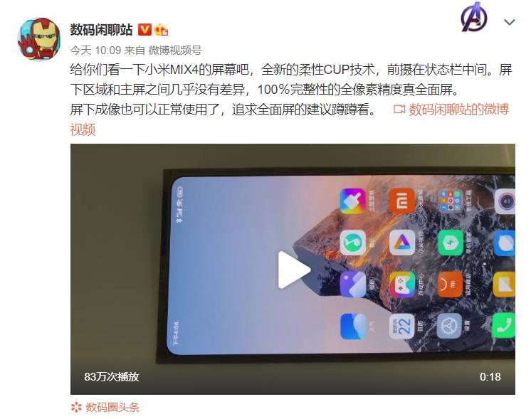 但是根据爆料,MIX4的屏幕将使用全新的柔性CUP技术,前置摄像头就在状态栏中间。