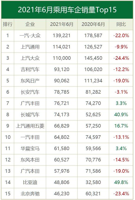 受到芯片供应不足影响,6月份国内乘用车销量同比下滑11.0%。头部车企中,合资品牌表现相对较差。其中,南、北大众以及北京奔驰下滑均超过20%,东风日产、广汽本田下滑达到19%。