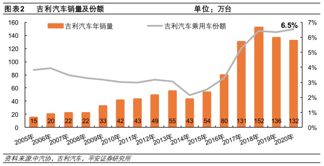 凭借着创始人李书福对汽车事业的坚持和热爱,早期的吉利一面通过农村包围城市、低价占领市场的方式得以在汽车领域占据脚跟,另一面通过升级生产线、自主研发等方式提升产品质量、提高品牌定位,不断冲击中高端市场;此后,吉利又通过全面收购沃尔沃的方式震撼整个行业,并藉此带动了技术进步与品牌美誉度的提高。至2017年,吉利汽车销售正式跃居自主品牌首位,并将这一销量保持到了现在。
