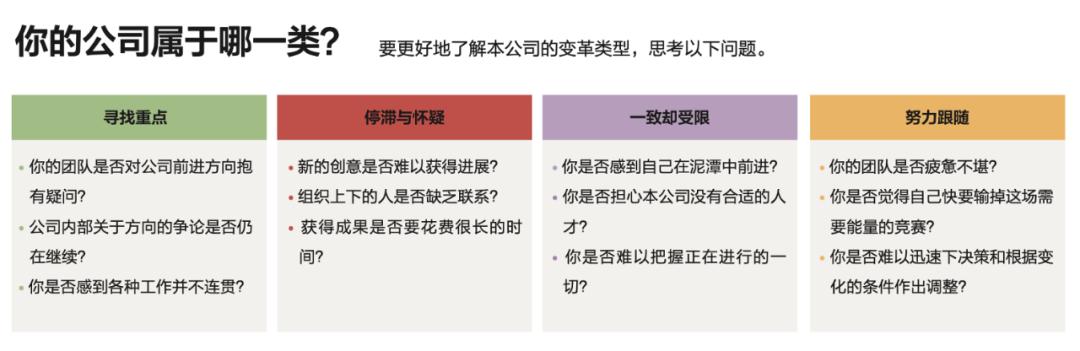 每家公司的变革力影响因素都有其自身的平衡。不过我们发现,大部分公司的状况符合四个通用原型之一:寻找重点、停滞与怀疑、一致却受限以及努力跟随。每种原型都有相应的“症状”和应对方法。