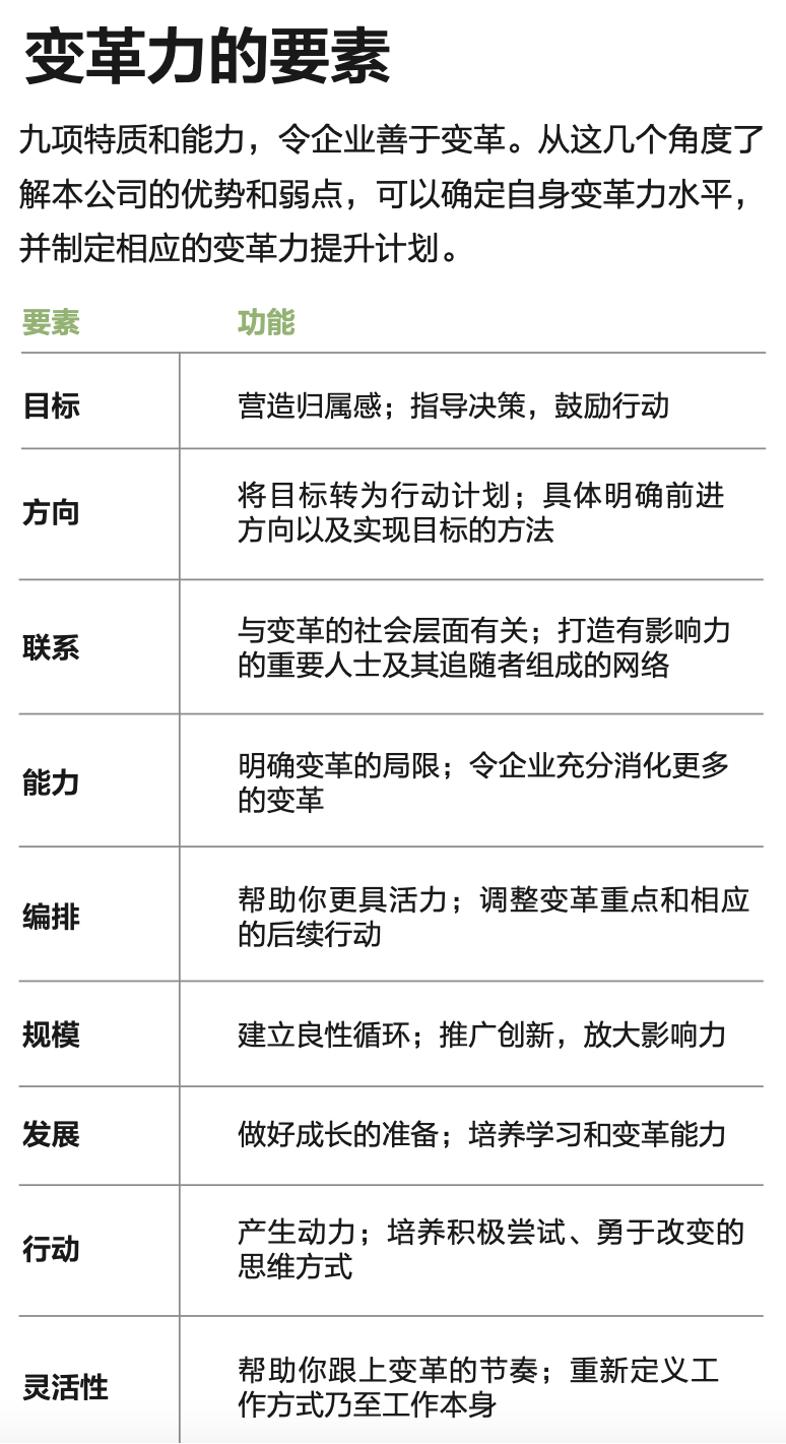 我们总结出变革力出众的公司共通的九条特质和能力: