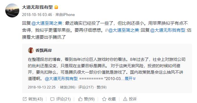 事实上,这已经不是段永平第一次抄底腾讯。根据他在雪球上的分享,2018年游戏行业处于低谷时段永平就曾抄底腾讯。腾讯也是除苹果、茅台外,段永平在二级市场关注最多的个股之一。