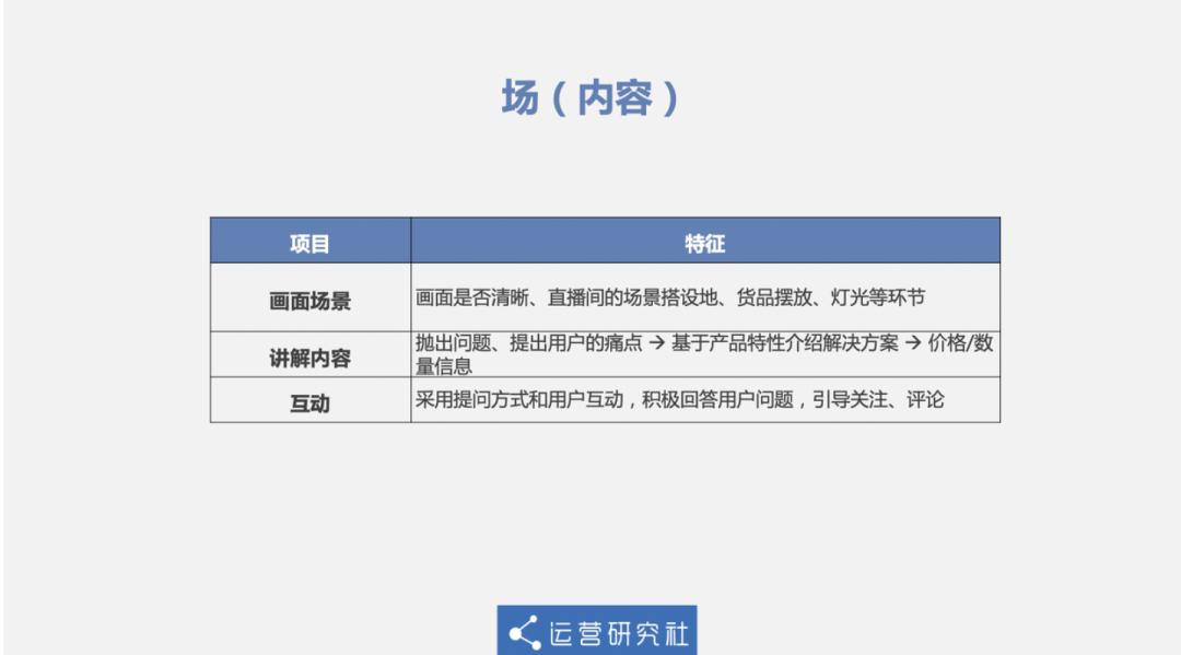 第三个要素「场」,具体指的是直播间的内容,包括了画面、场景、讲解内容、互动形式等等。
