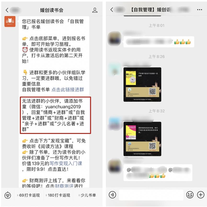 同时,她还创建了“媛创读书会”公众号,并在社群里提供“监督和交流”服务,帮助用户更好地读书。