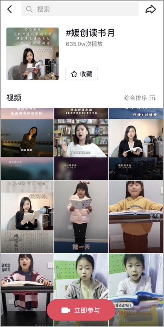 比如,她在抖音上创建了一个 #媛创读书月 话题,让小孩进行朗读挑战,检验督促孩子们的读书状况,已经有 635w 的视频播放量。