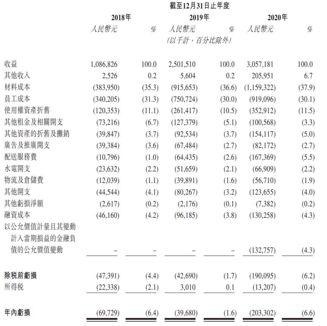 材料成本和员工成本占据了开支的大头,2018-2020年,二者都分别保持了30%以上的占比。其中,材料成本及占比都在逐年升高,从2018年的3.8亿元(占35.3%)增长至2020年的11.6亿元(占37.9%),增幅高达205%。员工成本2020年为9.2亿元,较2018年增幅也高达171%。