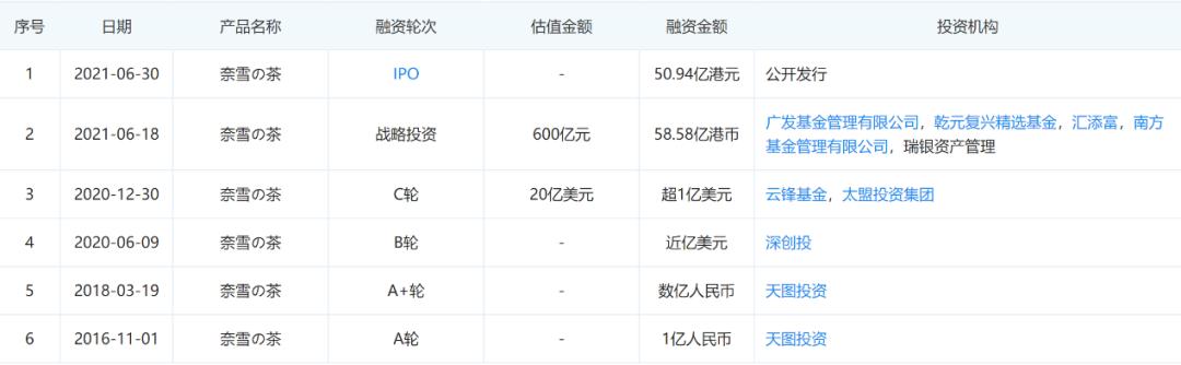 2015年开出第一家店,2016年便获得1亿元的A轮融资;2018年再次获得数亿元的A+轮融资,当年门店同比增速高达110.97%;2020年C轮融资后,估值已达20亿美元。今年IPO之前,奈雪的茶估值达到600亿元人民币,背后站着广发基金、南方基金、瑞银资产、云峰基金、深创投等知名机构,门店数量达556家,覆盖66座城市。