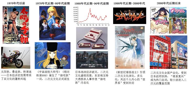我们将日本二次元文化粗略划分为五个阶段,几乎与日本近四十年的经济发展分期重合: