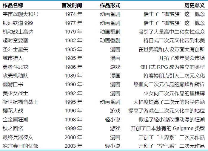 二次元作品的潮流可谓“十年河东,十年河西”:1980年代最流行以《七龙珠》为代表的热血系和以《尼罗河女儿》为代表的少女系,以至于形成了工业化的套路;1990年代,《攻壳机动队》《新世纪福音战士》掀起了哲学乃至玄学思考的潮流,对传统套路进行了反动;2000年代,抛弃宏大叙事、回归日常生活又成为主流,“世界系”“日常系”乃至“空气系”作品大行其道;2010年代更是异彩纷呈,二次元文化已经分化为“宅、萌、腐”等多个分支,二次元受众呈现全年龄化、全职业化的趋势,已经很难分辨出具体的潮流。
