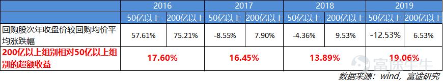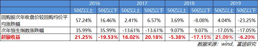 根据富途研究报告显示,以市值50亿港元作为分水岭,市值在50亿港元以上的公司更容易因为回购而使公司股价提升,并在次年获得显著的超额收益(对比恒生指数)。
