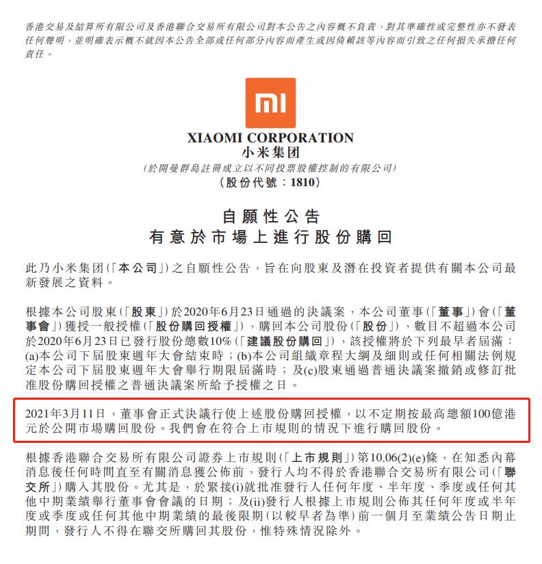 如此亮眼的成绩都源于,前一天小米发布的股票回购公告。该公告表明,小米董事会决议行使回购授权,以不定期按最高额100亿港元于公开市场回购股份。