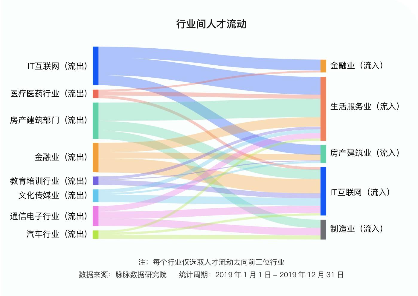 2019年,从年初到年末,百度、美团、知乎、滴滴、网易、熊猫TV、KEEP、暴风等众多科技互联网公司都纷纷做出了裁员优化的决定。涉及到的行业也逐渐从互联网延伸到了“互联网+”领域。但2019年、2020年随着社区团购、在线教育行业的发展,这些互联网人才又纷纷被这些快速兴起的行业所吸纳。根据脉脉数据,互联网流出的人才主要去了金融行业、生活服务业以及房产建筑业。